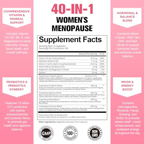 Specification: 40-in-1 Menopause Supplements for Women, Multibenefit & Complete Black Cohosh for Hot Flashes, Night Sweats & Hormone Balance, w/ Probiotics, DIM, Vitex, Dong Quai, Red Clover and More, 120 Vegan Caps