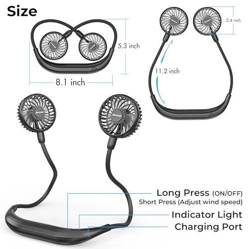Specification: AMACOOL 2600mAh Portable Neck Fan, Wearable Hands-Free Battery Operated with Ultra Quite & Strong Wind, 360° Adjustable Personal Fan Gifts for Hot Flashes Cruise Travel Outdoor Sports 2026-Black
