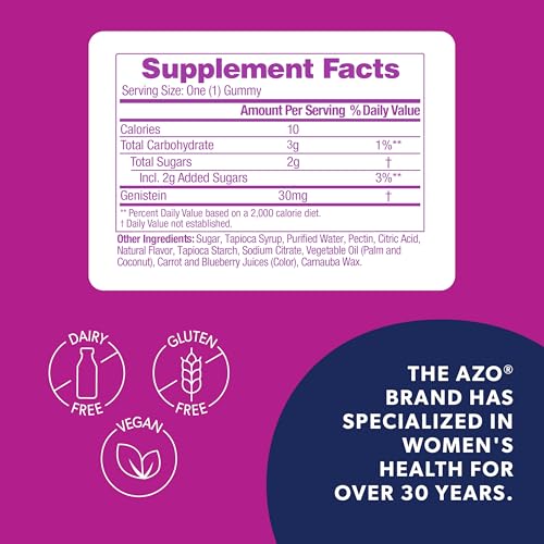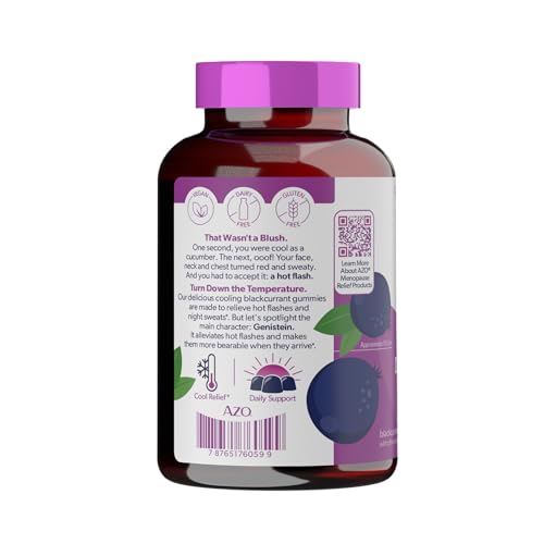 Take on menopause with a tasty, vegan gummy! AZO® Menopause Relief Daytime Gummies help manage the frequency and intensity of hot flashes and night sweats, so you can feel more comfortable throughout your day.* Formulated with clinically studied genistein, these delicious blackcurrant-flavored gummies provide hormone-free support for menopause symptoms—no pills required.*