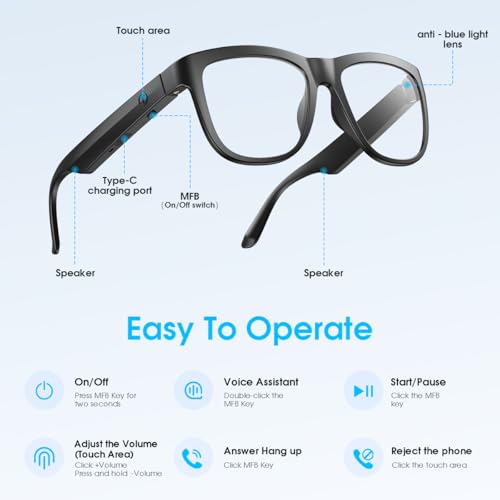 【Smart Voice Control & Easy Operation】Play or pause music, manage calls, activate voice assistant features with just one button, making your smart bluetooth glasses stylish and easy to use.