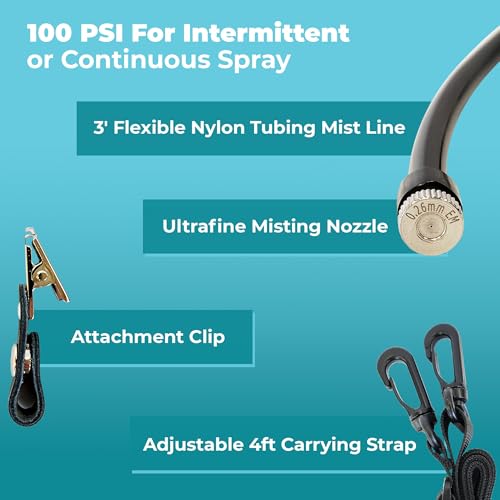 𝐇𝐚𝐧𝐝𝐬-𝐅𝐫𝐞𝐞 – Operate by using the push-lock on the trigger for continuous misting. The 3′ nylon mist line has an attachment clip that can be secured to any part of your clothing for convenience, allowing you to direct the mist where you need it most.