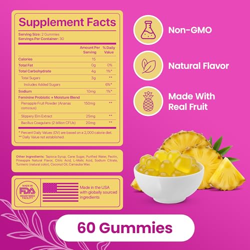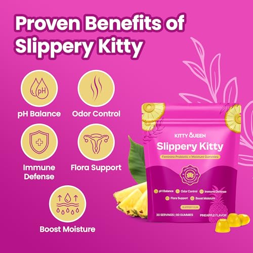 Specification: KITTYQUEEN Slippery Kitty Feminine Probiotic and Moisture Gummies, Pineapple Flavor, Women’s Probiotic Gummies for Vaginal Health, pH Balance, Odor Control, Flora Support and Moisture Boost, 60 Count
