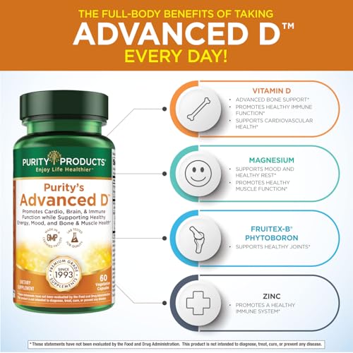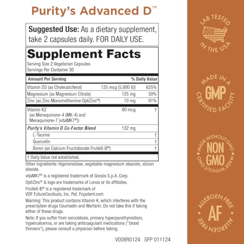 Purity Products Advanced D from Vitamin D3 Super Formula – Packed with Vitamin D, Vitamin K2, Zinc, Magnesium Citrate, Boron and Taurine – 60 Vegetarian Capsules